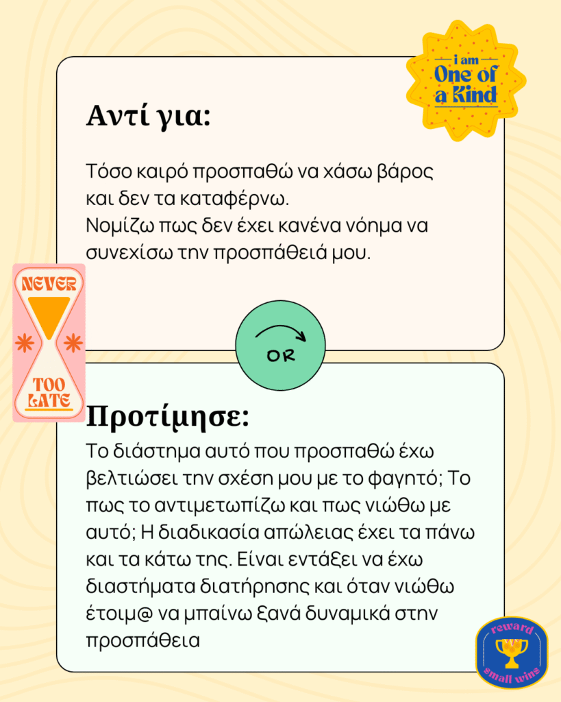 Μην εστιάζεις στην αυτοσυγκράτηση και στην αυτοπειθαρχία που πρέπει να δείξεις, αλλά στο πως μπορείς να ενισχύσεις την προσπάθειά σου.